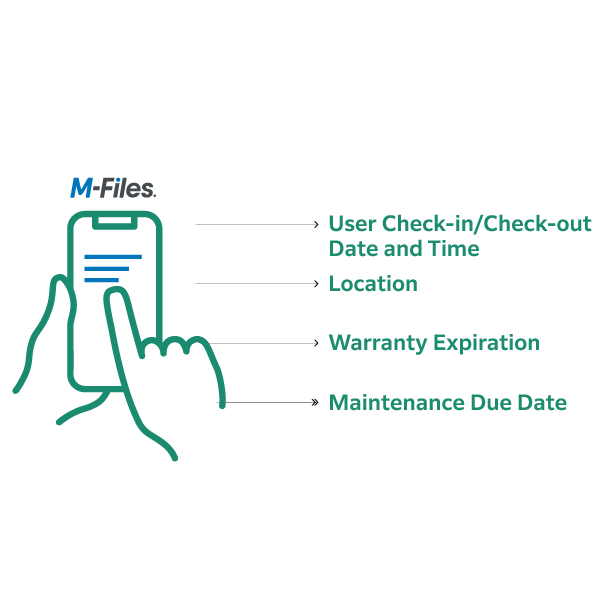 All assets are tracked centrally in M-Files with user check-in, check-out date/time, location information, etc.