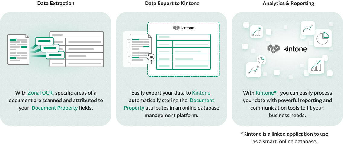 Unlock a unique end-to-end digitised system at the office: from creating e-documents to processing completed forms, and exporting data to Kintone’s central databases for enhanced records management and analytics. This way, you can be sure to align your data and communications for more efficient collaboration.