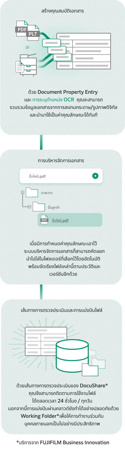 นี่เป็นเหตุผลที่ DocuWorks ภูมิใจนำเสนอโซลูชันการบริหารจัดการเอกสารแบบดิจิทัลที่คุณไว้วางใจได้ เพื่อให้ขั้นตอนการทำงานทั้งหมดรวมไว้ในที่เดียวโดยเริ่มต้นจากฐานข้อมูลส่วนกลาง แพลตฟอร์มอัจฉริยะของเราช่วยให้คุณกำกับดูแลการสร้าง แจกจ่าย และจัดเก็บไฟล์ทั้งหมดที่จำเป็นต้องใช้ คุณจึงมองเห็นทุกอย่างและควบคุมขั้นตอนการทำงาน ตั้งแต่การออกแบบไปจนถึงการวางแผนและตรวจสอบคุณภาพของสินค้าที่ผลิต