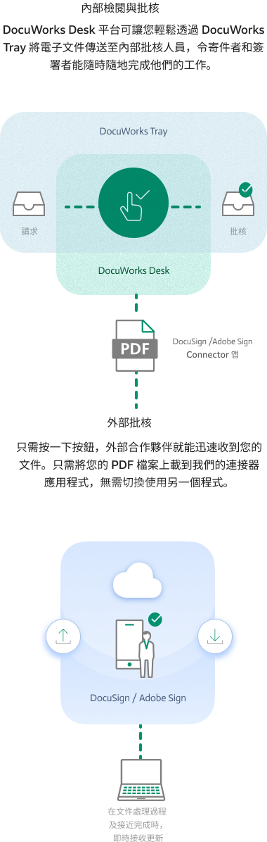為解決此問題,DocuWorks 推出全面點對點數碼批核方案,將 DocuSign 及 Adobe Sign 等著名電子簽署應用程式整合到您現有的工作流程中。