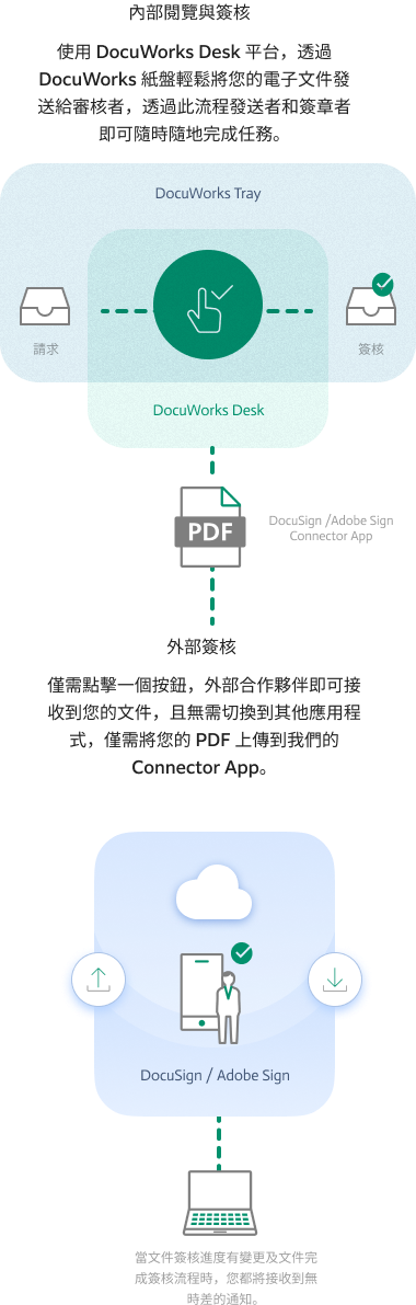 為解決此課題,DocuWorks 提供一個全方位端對端數位解決方案,將最為廣泛採用的電子簽章應用軟體,如 DocuSign 和 Adobe Sign 整合進您現有的工作流程。