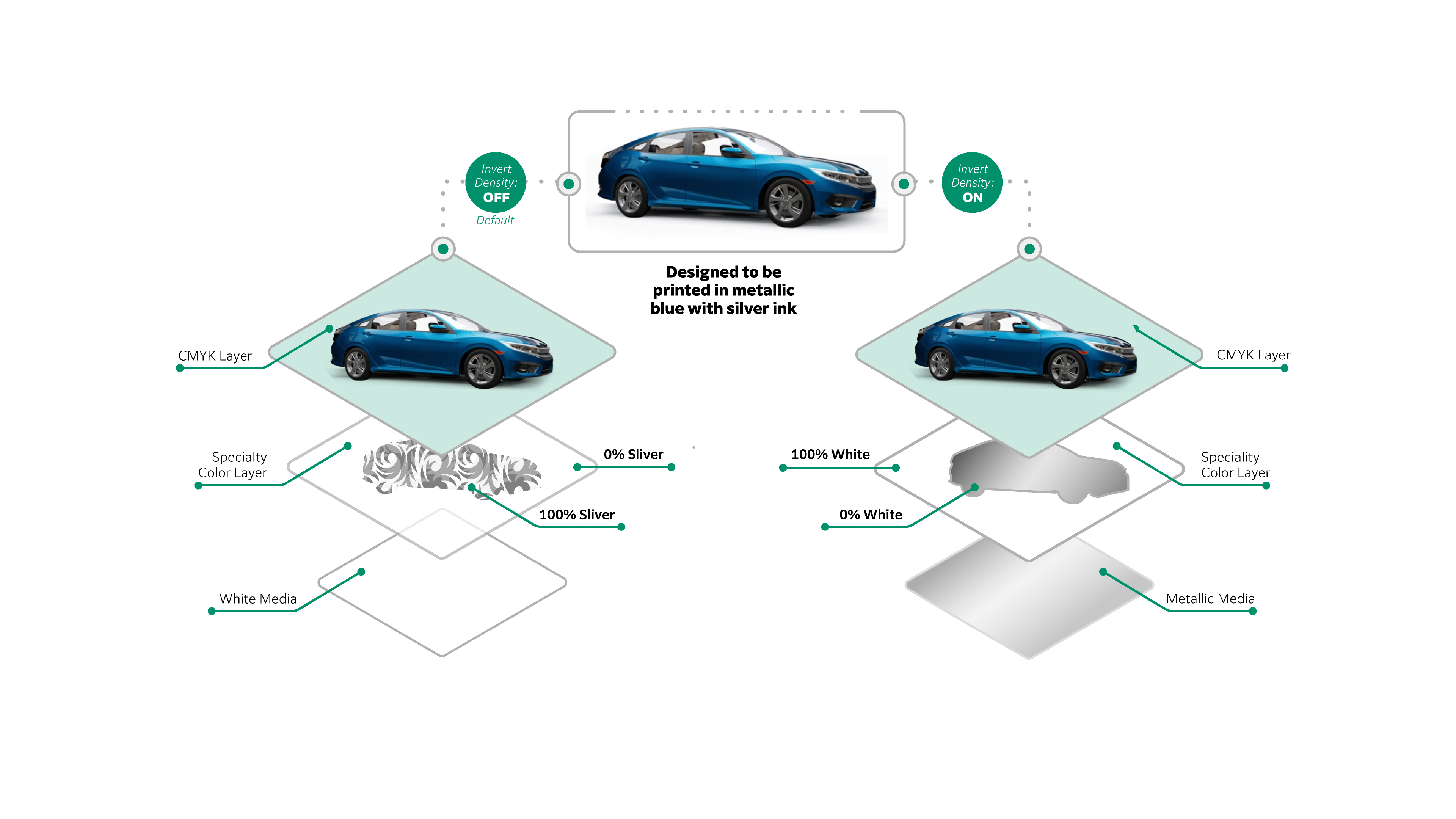 在金属纸上使用白色墨粉和 CMYK,利用介质的光泽区域模拟金属效果,从而创建金属效果或金属色。
